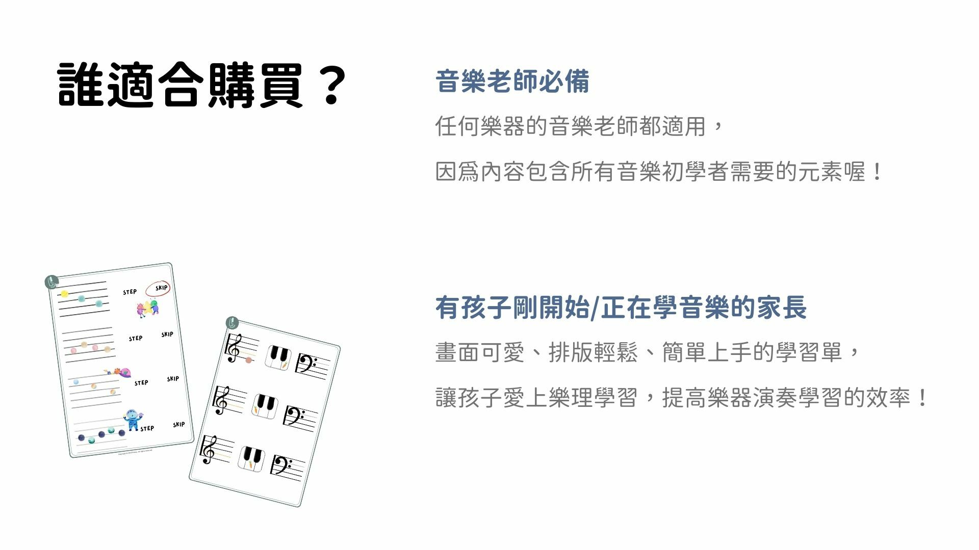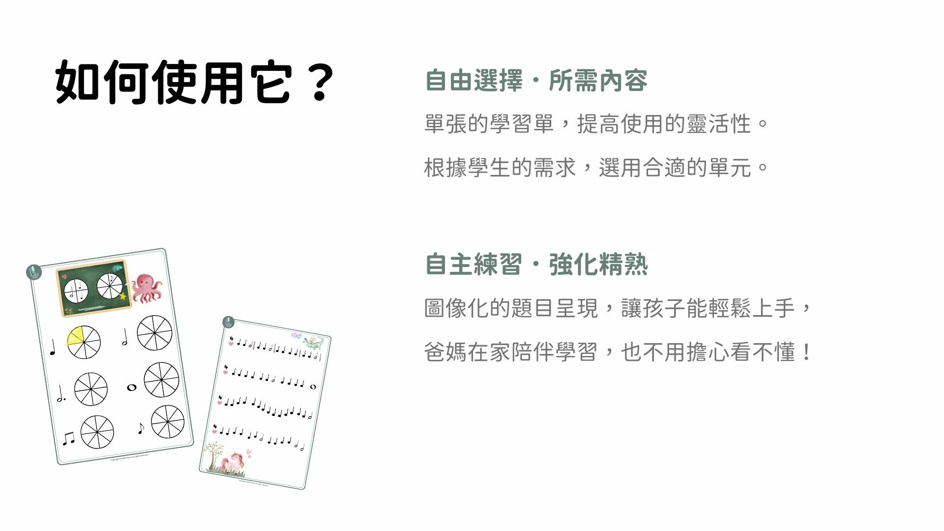 學習單在手希望跟著走同時滿足樂理教學與孩子心情轉移的需求。孩子喜愛、看了覺得簡單想一寫再寫的學習單,絕對是你的必備勝品!簡單易懂的設計,讓家長也能輕鬆陪伴孩子在家練習喔!