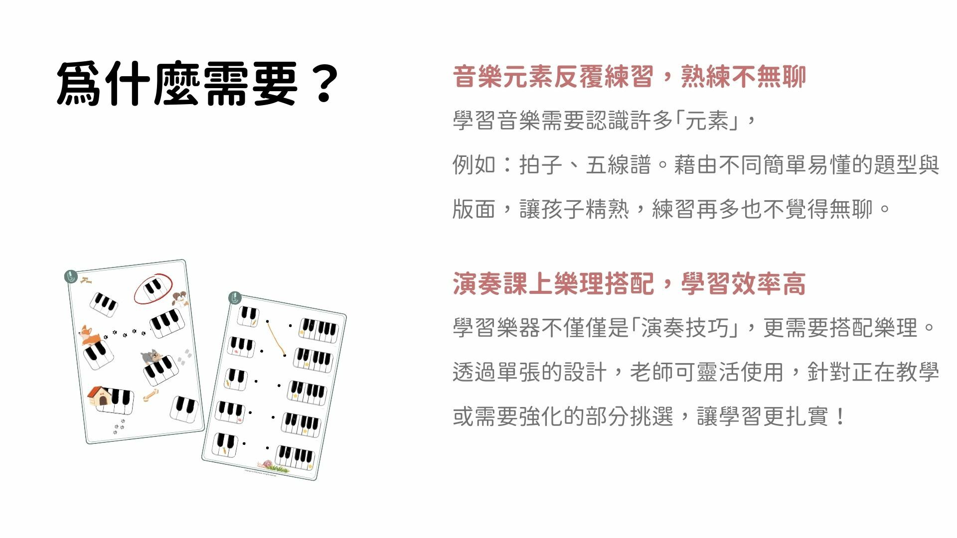 上課時,總有許多不可預測的狀況會發生。孩子不專心、突然不想彈琴、有點累、瞬間不會看譜、某個樂理概念卡關..等等,這時候,除了遊戲、卡牌、繪本、聽音樂,「學習單」更可以說是音樂老師的救星!